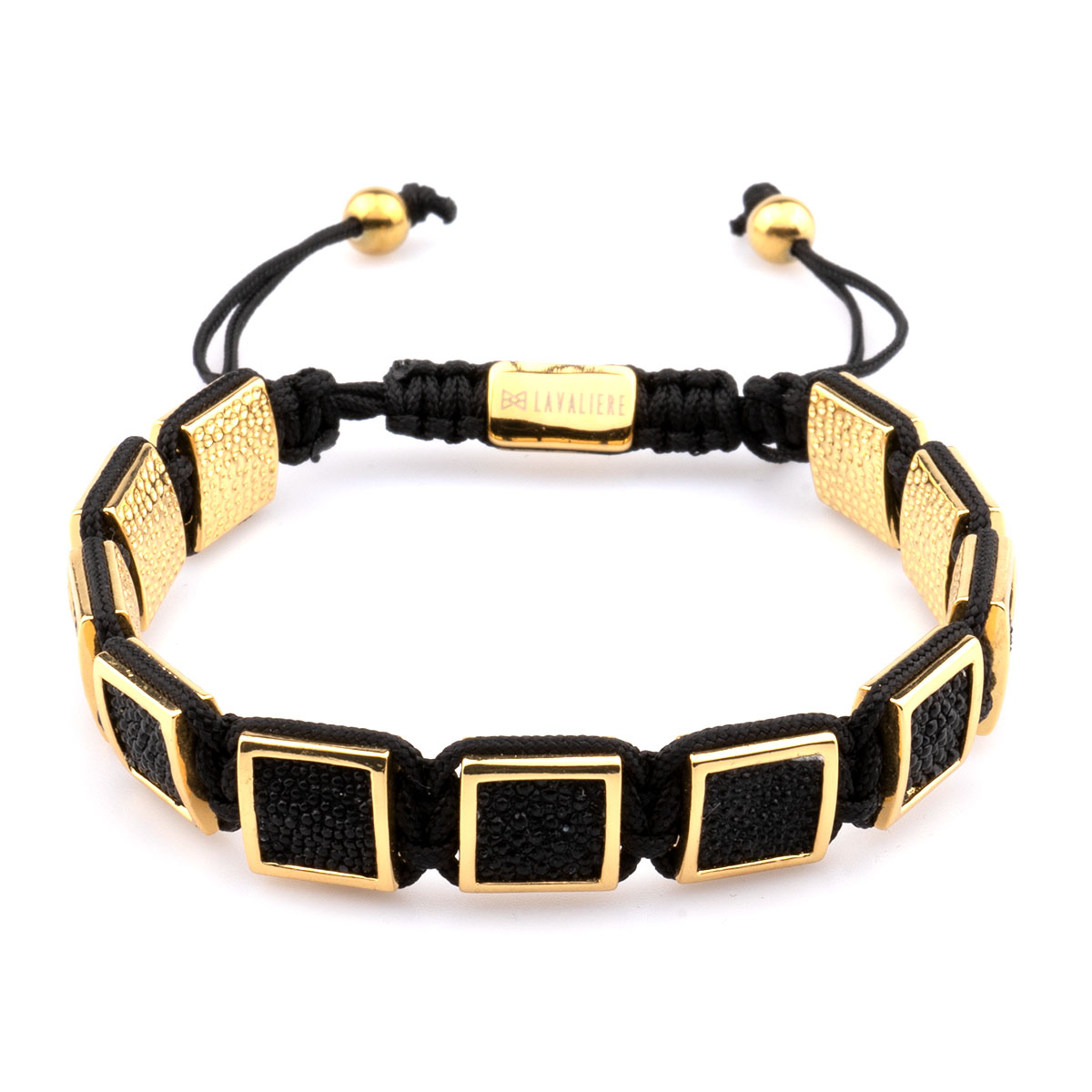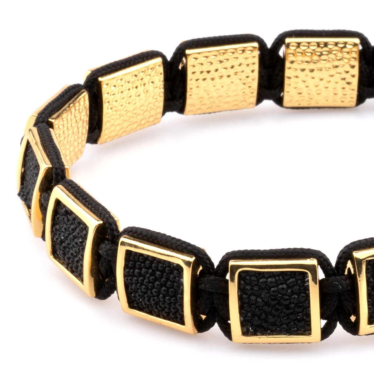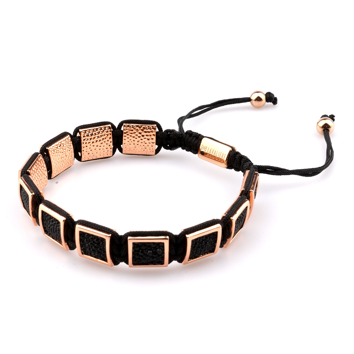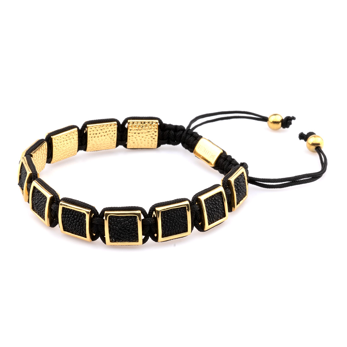 Jde o ručně vyrobený náramek z chirurgické oceli. Má univerzální vázání macrame. Na konci vázání jsou ještě korálky z chirurgické oceli. A to ve stejné barvě, jako celý náramek. Kožená část je vytvořená z imitace rejnočí kůže a je šetrná ke zvířatům. Kůže je extrémně pevná, má velmi dlouhou životnost a je odolná vůči vlhku. Jednou z typických vlastností výrobků z této kůže je jeho charakteristický povrch. Ozdobte své zápěstí nadčasovým doplňkem. Vypadá pěkně na dámském i pánském zápěstí. A to v jakémkoliv ze 4 barevných kombinací.